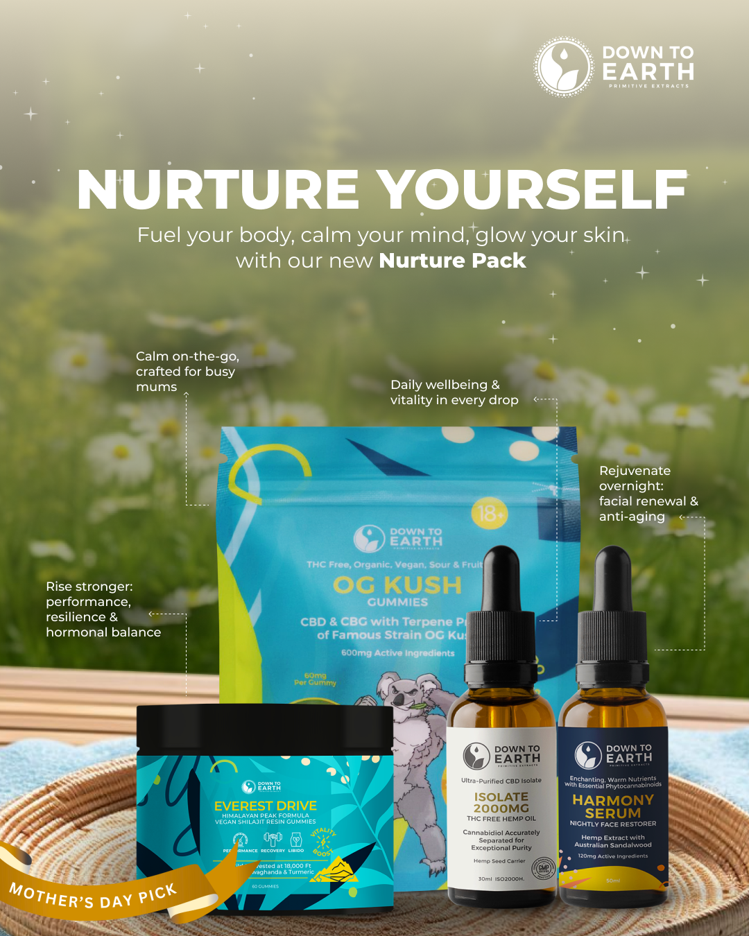 The Nurture Pack opens with OG Kush Gummies and Iso2000 THC-Free Hemp Oil, two clean-label essentials for on-demand calm and daily enrichment. The gummies blend fast-acting, plant-derived terpenes and flavonoids to create a quietly focused moment whether it’s school runs or conference calls. Iso2000’s hemp-derived cannabinoids work in harmony with your body’s natural systems to help maintain balance and steady energy—no high, just pure support in every drop.