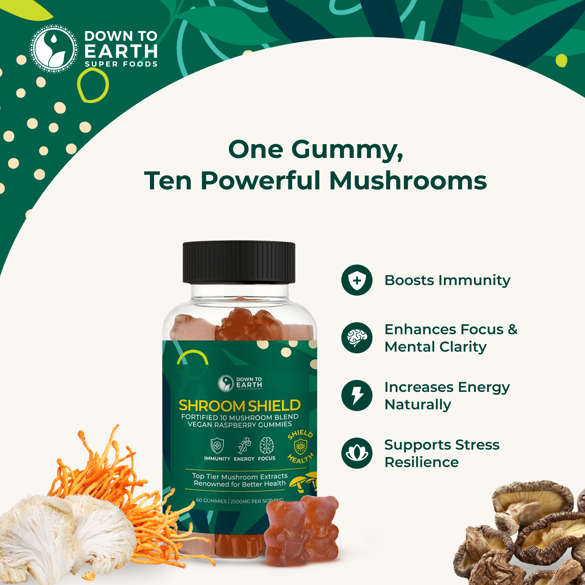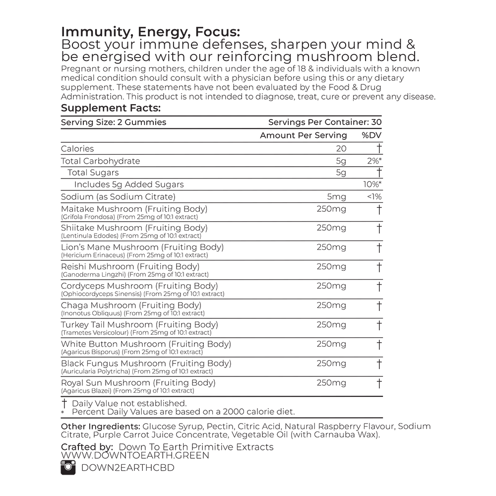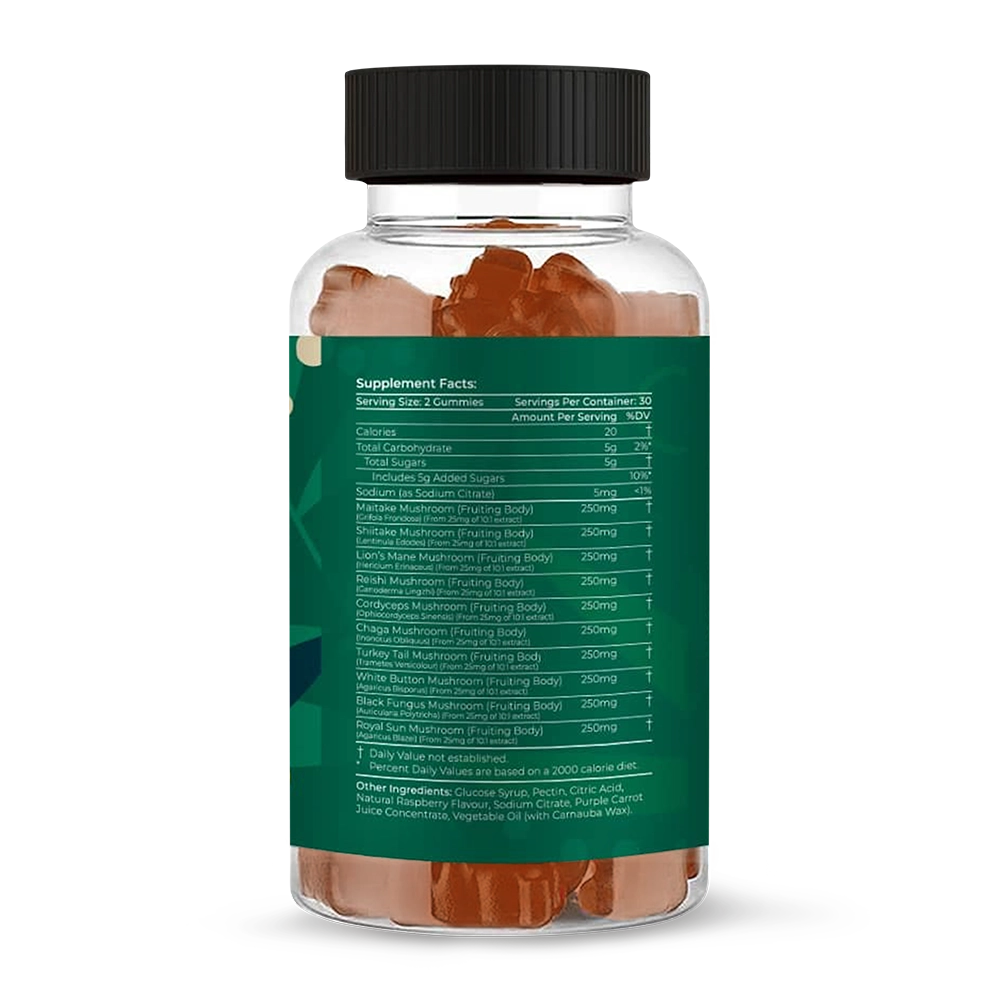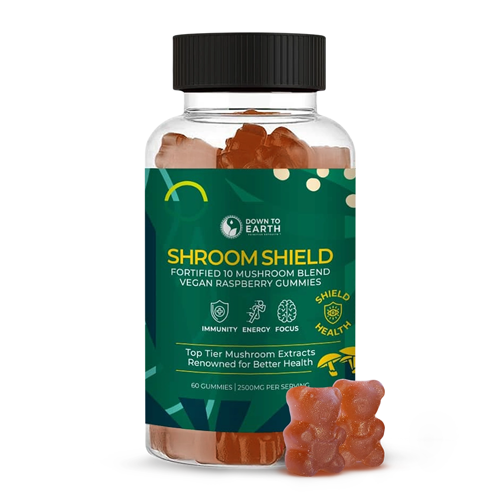 Elevate your wellness routine with Shroom Shield, a powerful fortified mushroom blend designed to boost immunity, energy, and focus. Each serving (2 gummies) features a robust 2500mg blend across 60 delicious vegan gummies, delivering a potent 1250mg per gummy of each of the ten medicinal mushrooms to help you thrive every day.